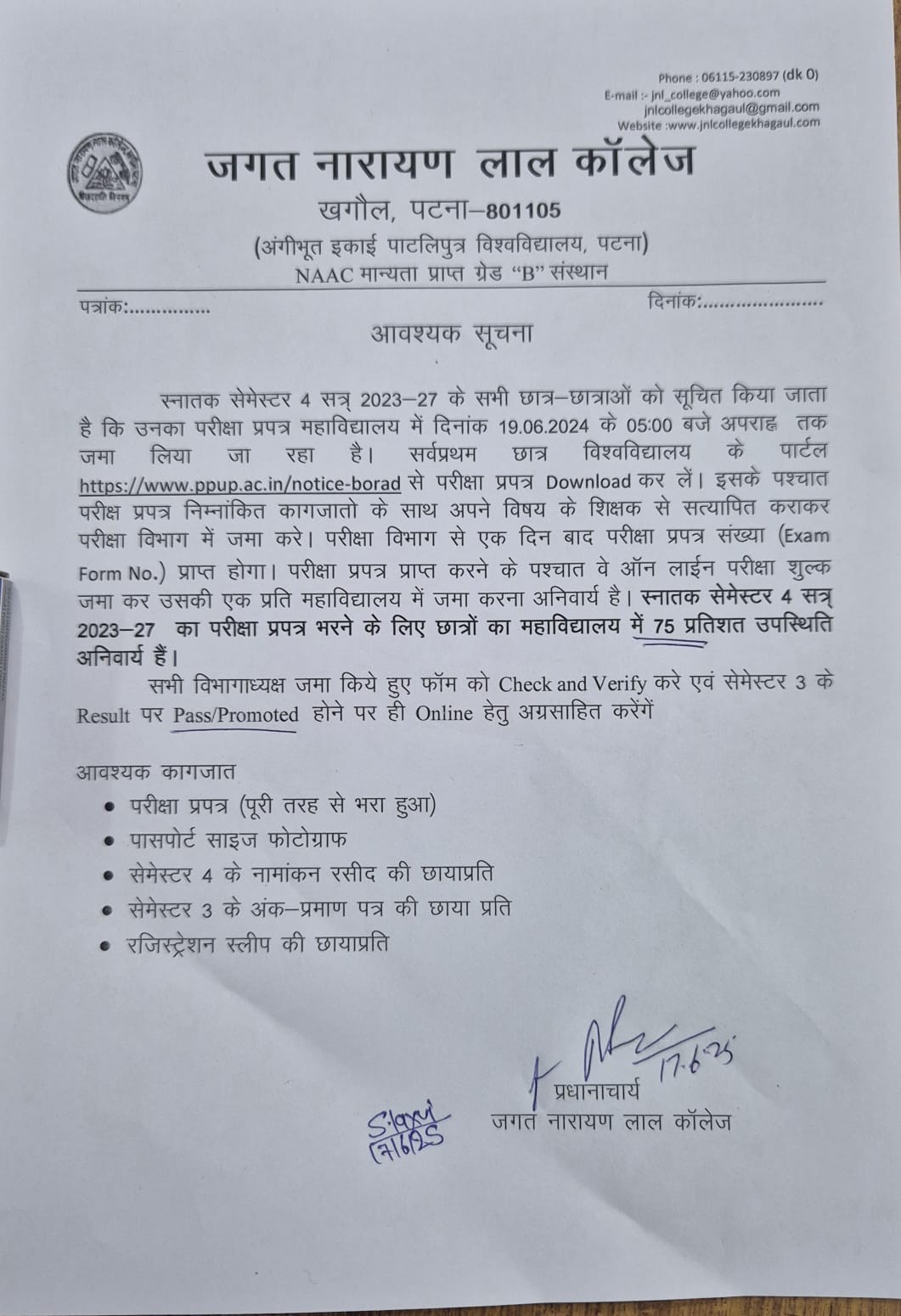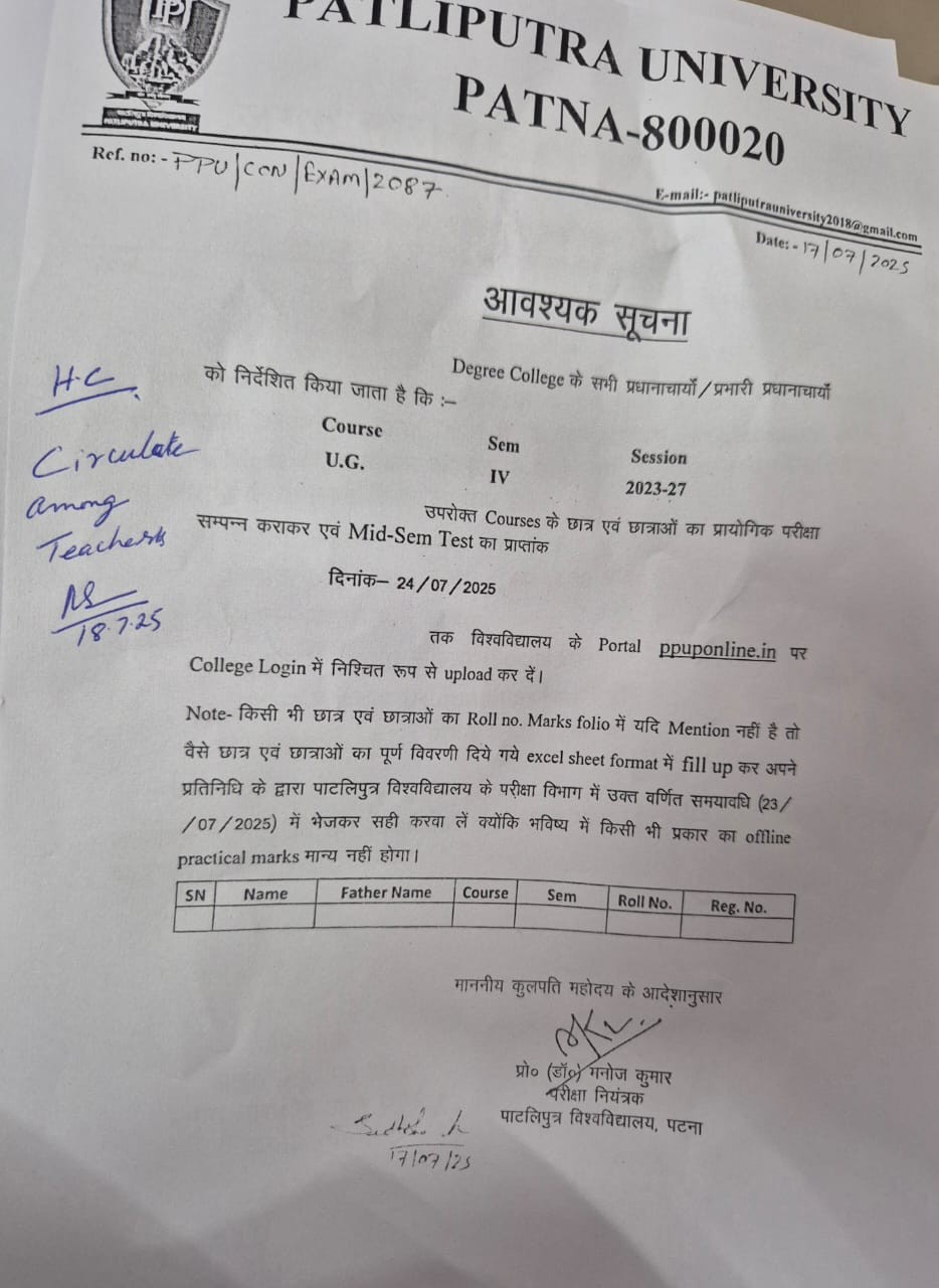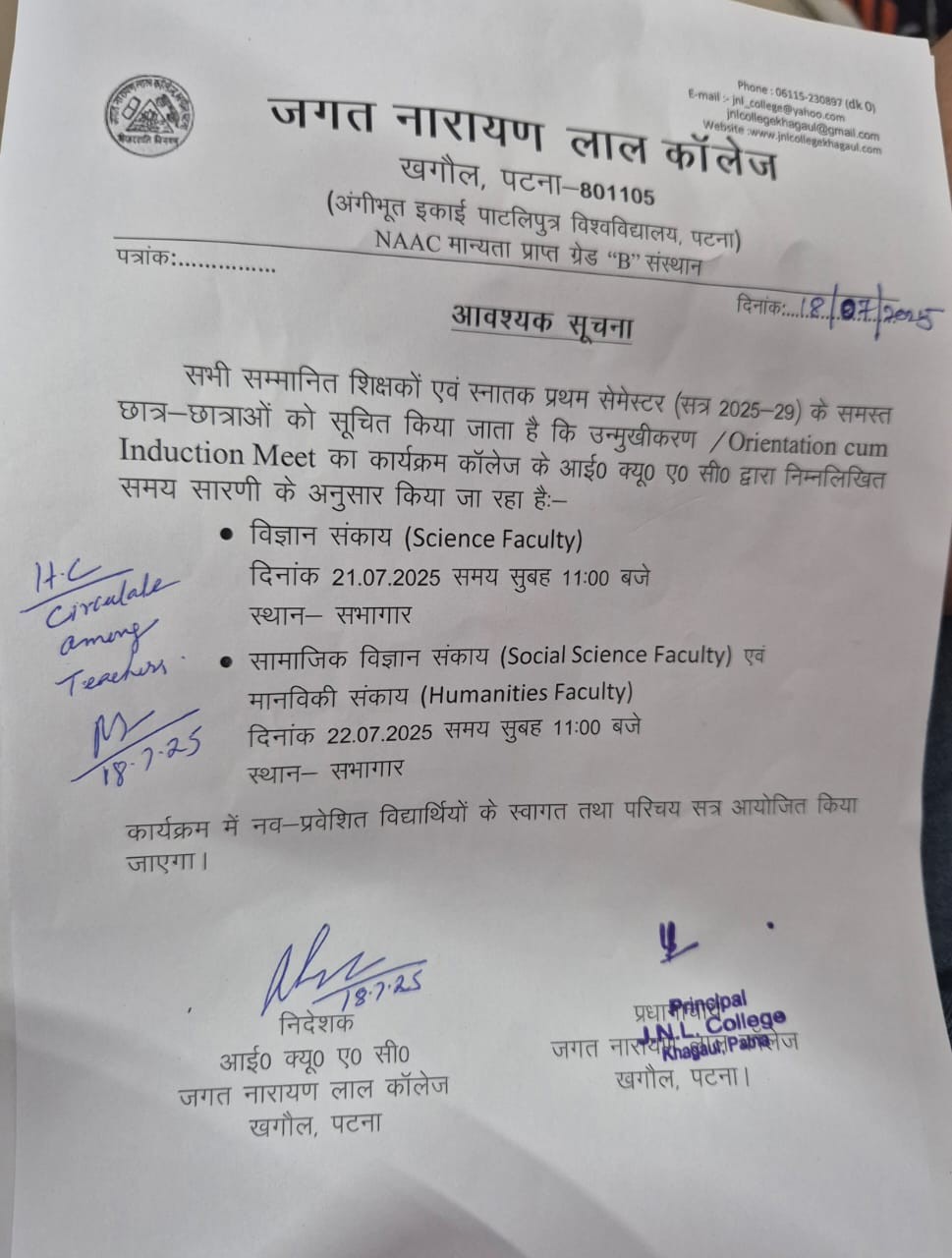 Jagat Narain Lal College (A constituent unit of Patliputra University, Patna, Bihar) was established in the year 1960. The land was then donated by Late Jagat Narain Lal, who was a well known freedom fighter and a Cabinet minister of Bihar in was humbly started in the year1950s. The college is situated 1 Km South of the Danapur Railway Station and 5 Km to the Jay Prakash Narayan International Airport. This college was established with the motive of spreading the light of education among the weaker section of this backward semi-urban area, where most of the residents had agricultural background. It should be noted that, this was the only college imparting education up to graduation level in this semi-urban area. It was first affiliated to Bihar University, Muzzaffarpur on dated 23rd March, 1960 but later on it becomes the constituent unit of Magadh University, Bodh Gaya.
